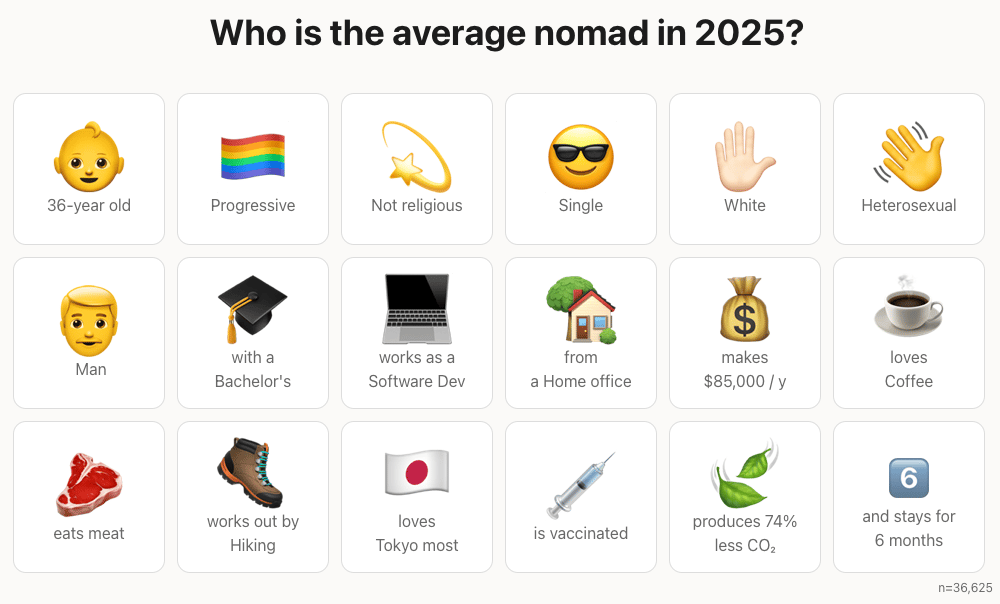 According to Nomads’ comprehensive 2025 report, today's typical digital nomad might surprise you. They're 35 years old (unchanged from 2024), but their median income has held steady at $85,000 despite global economic pressures. What's particularly striking is the surge in CO₂ consciousness.